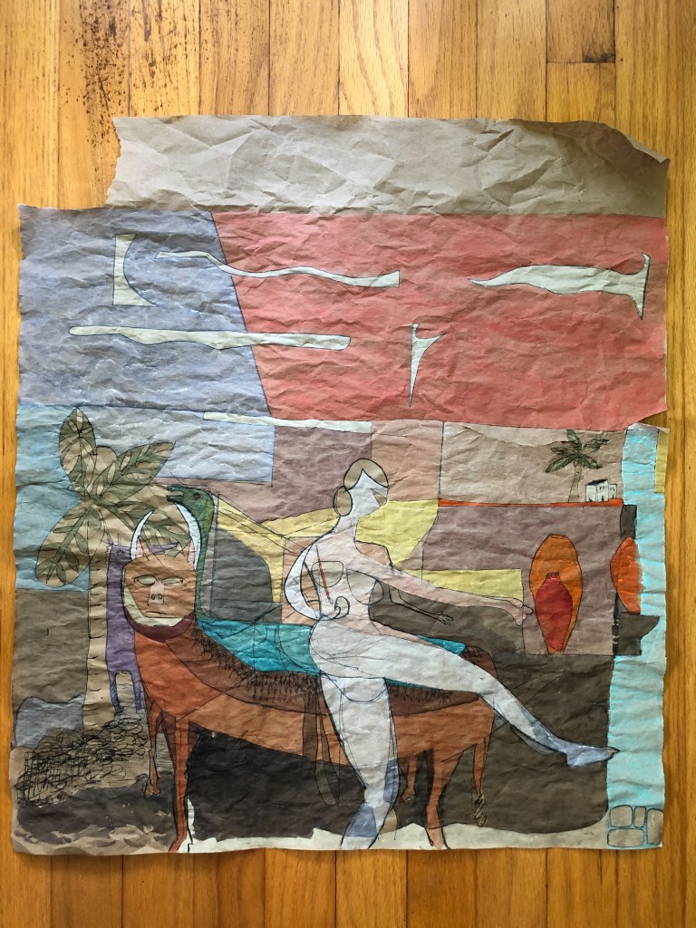 Several interpretations are possible about the oxen, artist, and jungle-like space. The oxen is a traditional symbol for work. Be the work plowing fields or plodding along. The sinuous artists with bulging eye and outstretched hand is focused on a grouping of vases, which can represent usefulness, potential, and especially for me, creativity and beauty like in a flower vase. It’s finding a balance between work and creativity that inspires this artist.