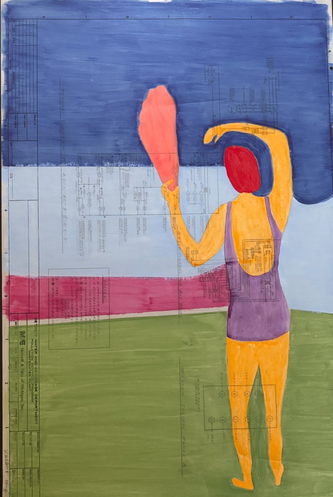 Water increasingly rare or too much, ubiquitous, highly useful, is used, abused, filtered, and treated numerous times on its journey from cloud to river to aquifer to ocean. The engineering drawing from 1987 specifies the control strategies for a Detroit water processing facility. Electronic controls, though simpler than today’s computer driven technologies, indicate the opening and closing of valves, timing, temperatures to process Detroit public water. Here a woman offers gratitude in the form of a found dragonfly wing to water.